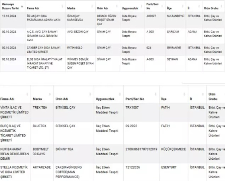Tarım ve Orman Bakanlığı taklit ve tağşiş yapan firmalar listesine bu kez çay markalarını ekledi. Bakanlığın "guvenilirgida.tarimorman.gov.tr" adresi üzerinden yayımladığı gıda sahtekarları listesi güncellendi. Bakanlık yaptığı denetimlerde 7 firmanın ürettiği çaylara "İlaç Etken Maddesi" ve gıda boyası karıştırdığı görüldü. Gıda sahtekarları, çayın içine daha güzel renk vermesi için çeşitli ilaç maddeleri ve gıda boyası karıştırarak tüketicinin gözünü boyadı. Bakanlık, bu firmalardan ve markalardan tüketicilerin uzak durması gerektiğinin altını çizdi.