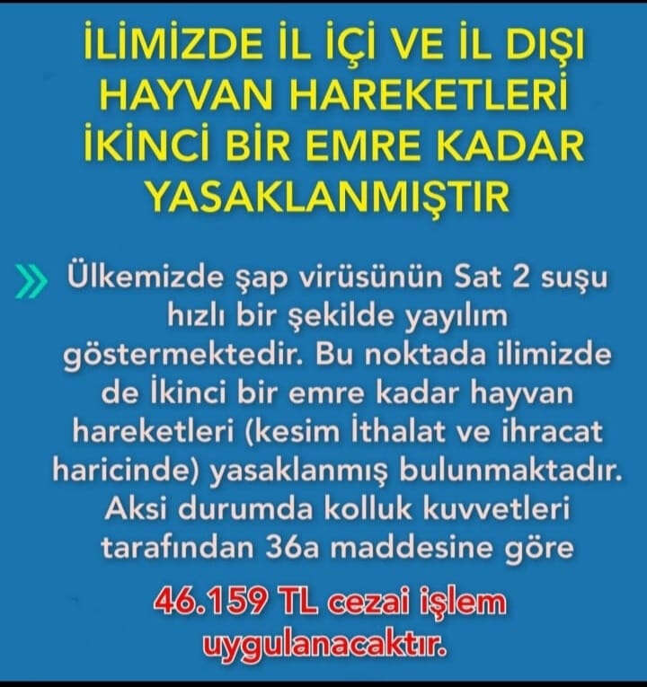 Ülkemizde yaygın olarak görülmeye başlayan Şap Hastalığı nedeniyle Tarım ve Orman Bakanlığı tarafından yurt genelinde il içi veya il dışı hayvan hareketleri yasaklandı.