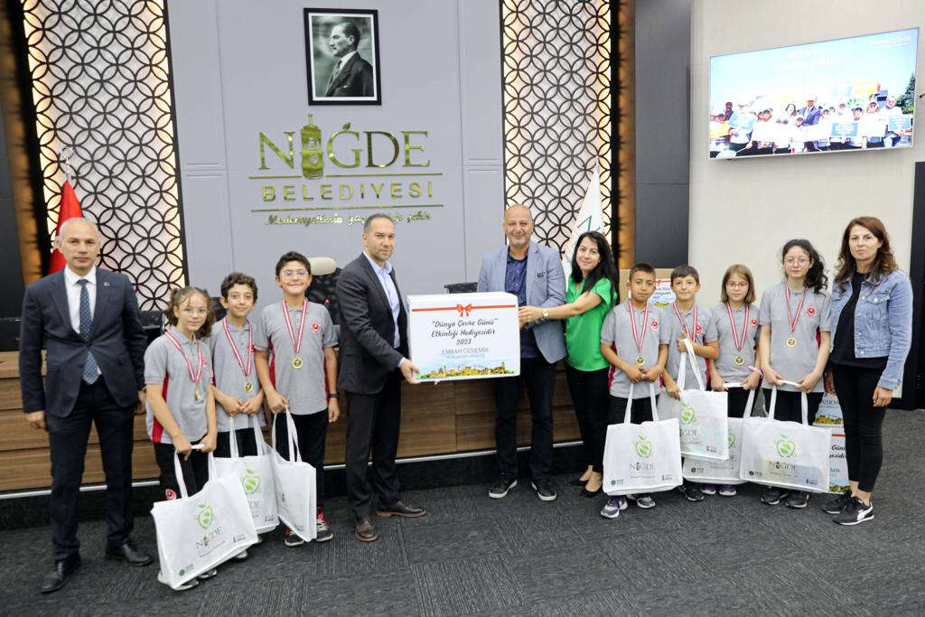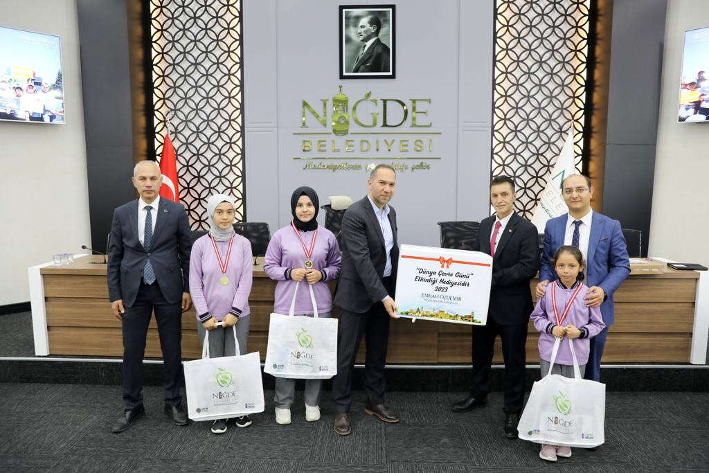 Çevre Haftası dolayısıyla Çevre, Şehircilik ve İklim Değişikliği İl Müdürü Necmettin Şeker ve beraberindeki müdürlük personellerini Belediyede ağırlayan Başkan Özdemir, aynı zamanda Dünya Çevre Günü’nde okullar arası atık toplama yarışmasında dereceye giren okullara ve öğrencilere hediyelerini takdim etti.