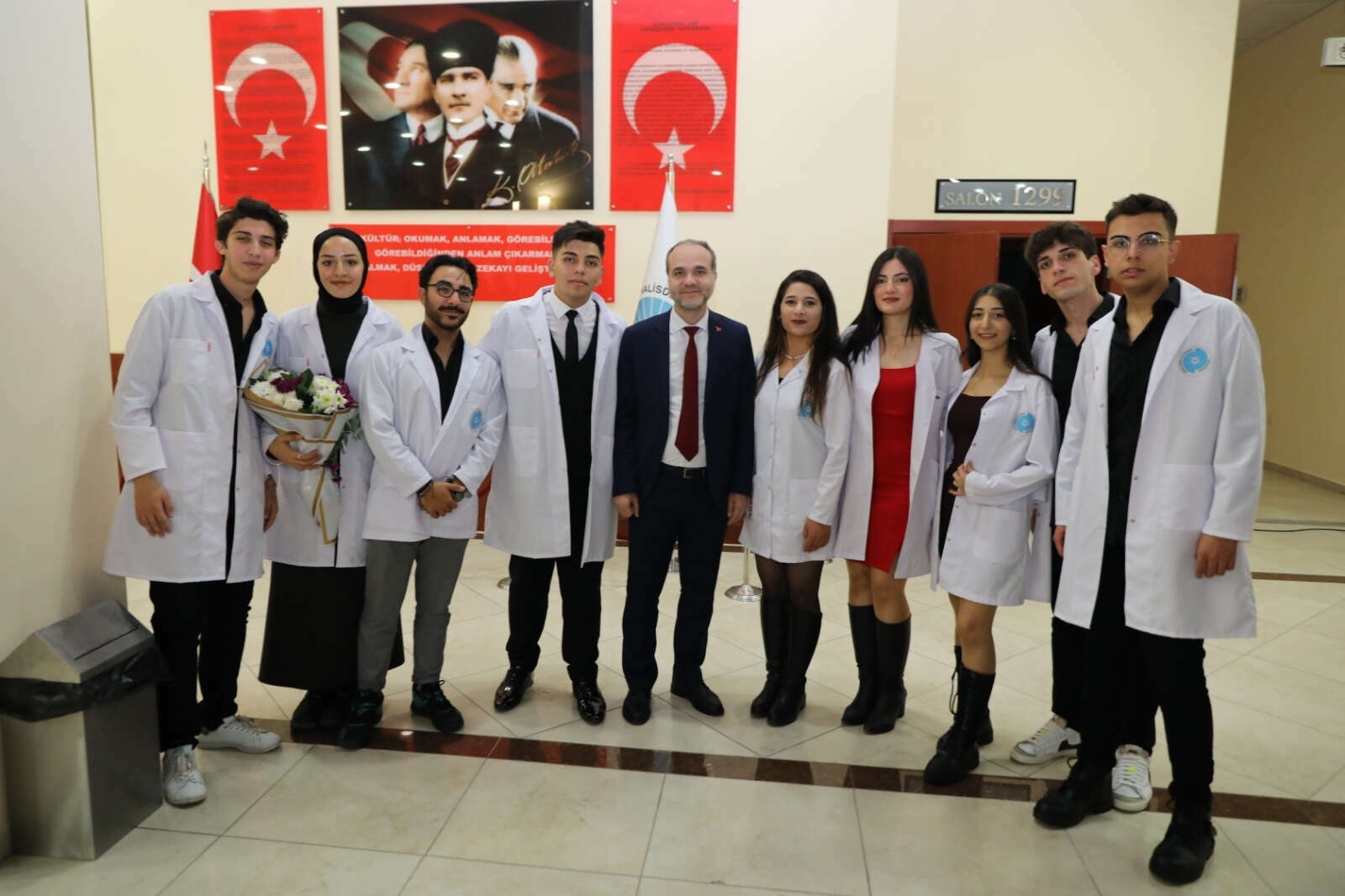 Fakültenin ilk öğrencileri adına programın açılış konuşmasını yapan Buğra Kayış konuşmasında “Diş Hekimliği Fakültesinin ilk öğrencilerinden olmanın gururunu ve mutluluğunu yaşıyoruz. Fakültemiz yeni bir fakülte olmasına rağmen hem klinik öncesi hem de klinik eğitimimiz için yeterli altyapıya sahip olması bizleri oldukça mutlu ediyor. Bugün giydiğimiz beyaz önlüğün dürüstlüğü ve iyi bir insan olmayı çağrıştırdığının farkında olarak bu önlüğü hiçbir zaman kirletmeyeceğiz.” ifadelerine yer verdi.