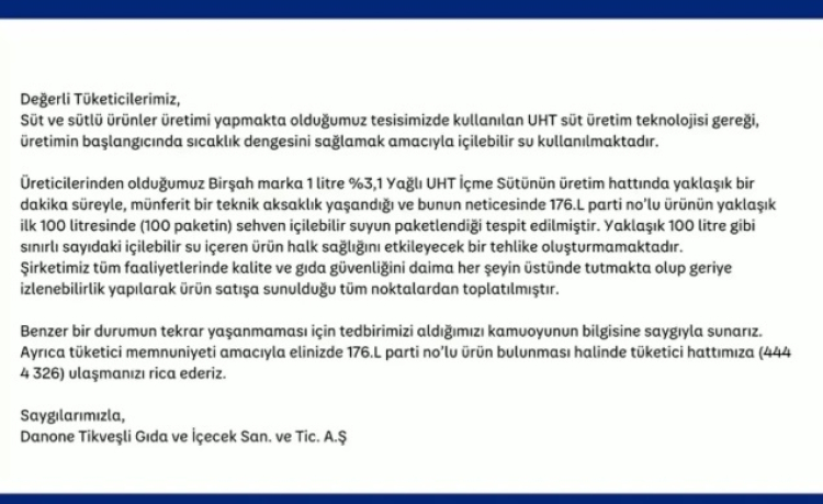 “Üreticilerinden olduğumuz Birşah marka 1 litre %3,1 yağlı UHT içme sütünün üretim hattında, yaklaşık 1 dakika süreyle, münferit bir teknik aksaklık yaşandığı ve bunun neticesinde 176.L parti numaralı ürünün yaklaşık ilk 100 litresinde (100 paketin) sehven içilebilir suyun paketlendiği tespit edilmiştir. Yaklaşık 100 litre gibi sınırlı sayıdaki içilebilir su içeren ürün halk sağlığını etkileyecek bir tehlike oluşturmamaktadır. Geriye doğru izlenebilirlik yapılarak ürün satışa sunulduğu tüm noktalardan toplatılmıştır.”