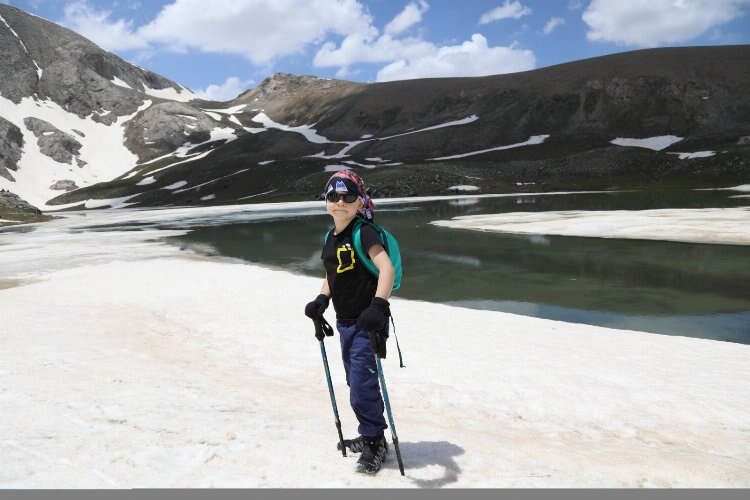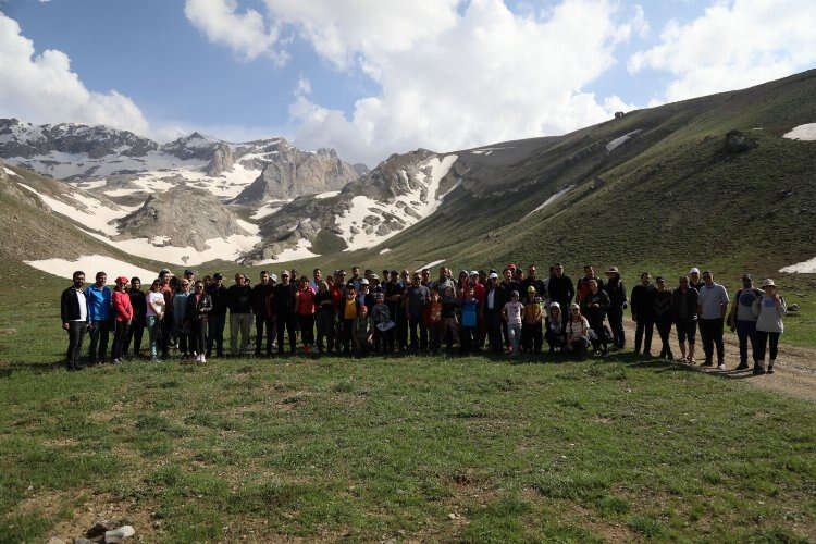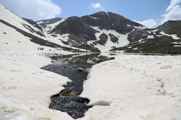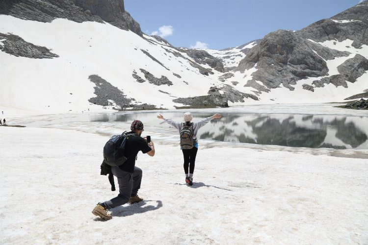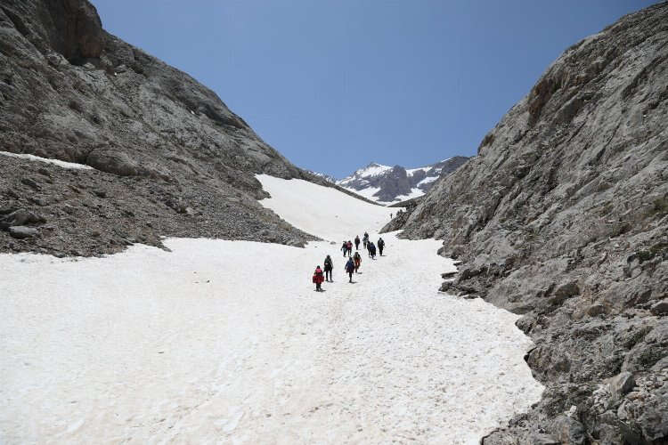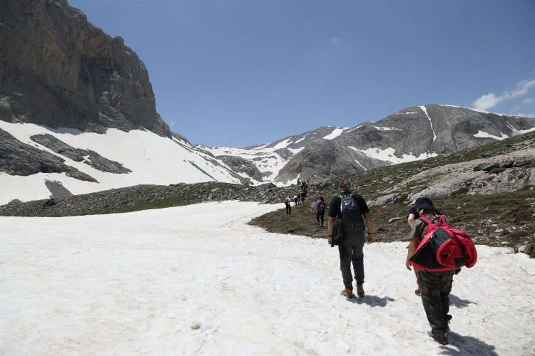 katılımcıların 30 derece sıcaklıkta, Meydan Yaylasından başlayan doğa yürüyüşü buzul göllere yaklaştıkça kar üzerinde devam etti.