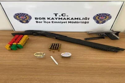 Bor İlçe Emniyet Müdürlüğü ekipleri tarafından gerçekleştirilen asayiş olayları ve uyuşturucu ile mücadele çalışmaları kapsamında, Yeni Göçmen Mahallesi'nde bulunan bir eve operasyon düzenlendi. Narkotik polis köpeği ile evde yapılan aramada, 1 adet tabanca, 1 adet şarjör, 38 adet mermi, 1 adet av tüfeği ve bu tüfeğe ait 16 adet fişek ele geçirildi. Polisler tarafından evde yapılan aramada ayrıca, 4,2 gram metamfetamin ve uç diye tabir edilen 2,09 gram uyuşturucu madde ele geçirildi. Operasyonda yakalanan şüpheli M.Ç. hakkında ise adli soruşturma başlatıldı.