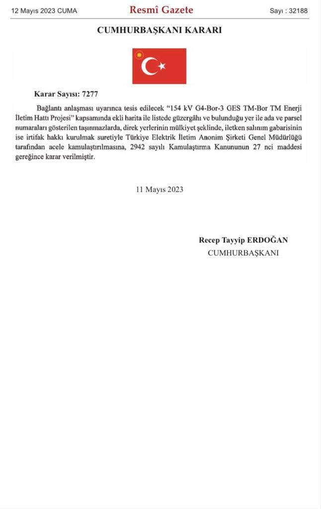 Niğde Bor Güneş Enerji Santrallerinin kurulması için gerekli yasal alt yapılar halledildi. 12. 05.2023 tarihli yayımlanan Resmi Gazete ile son pürüzler de ortadan kaldırılarak santrallerin kurulması ve üretilecek enerjinin vatandaşlarımızın kullanımına sunulması sağlanacak hale getirildi. Bor ilçemiz, yenilenebilir enerji üretimi konusunda ülkemizde ve dünyada önemli ve hatırı sayılır bir yere yükselecektir.