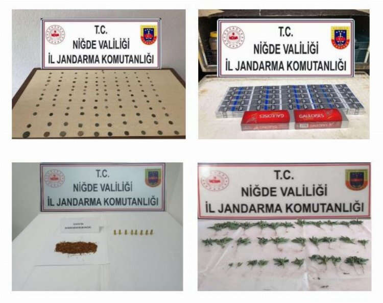 Niğde İl Jandarma Komutanlığı ve bağlı İlçe Jandarma Komutanlıkları ekiplerince; 05 - 19 Temmuz 2022 tarihleri arasında Uyuşturucu Madde ile Mücadele ve Kaçakçılık Olayları kapsamında icra edilen faaliyetler neticesinde; (110) paket bandrolsüz sigara, (15) gr. Bonzai, (83) gr Kubar Esrar, (41) kök kenevir bitkisi ve (8) adet 9 mm çapında fişek ele geçirildi.