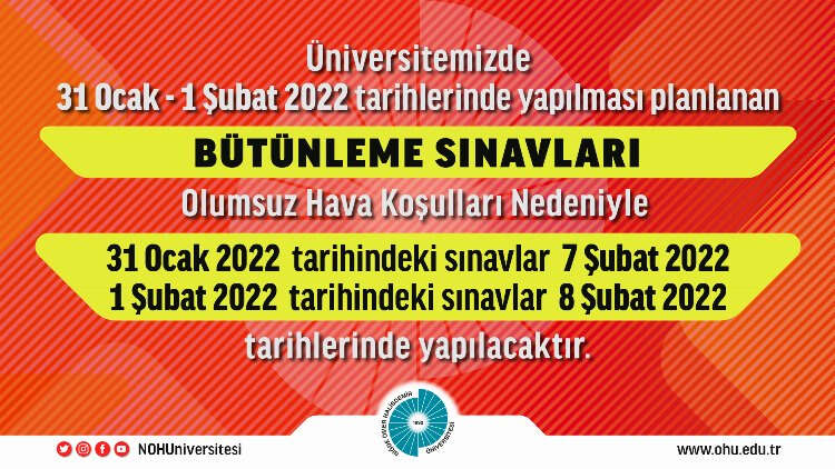 Niğde Ömer Halisdemir Üniversitesinden yapılan duyuruda; Olumsuz hava koşulları nedeniyle 31 Ocak 1 Şubat tarihleri arasında yapılması planlanan bütünleme sınavları ertelendi.