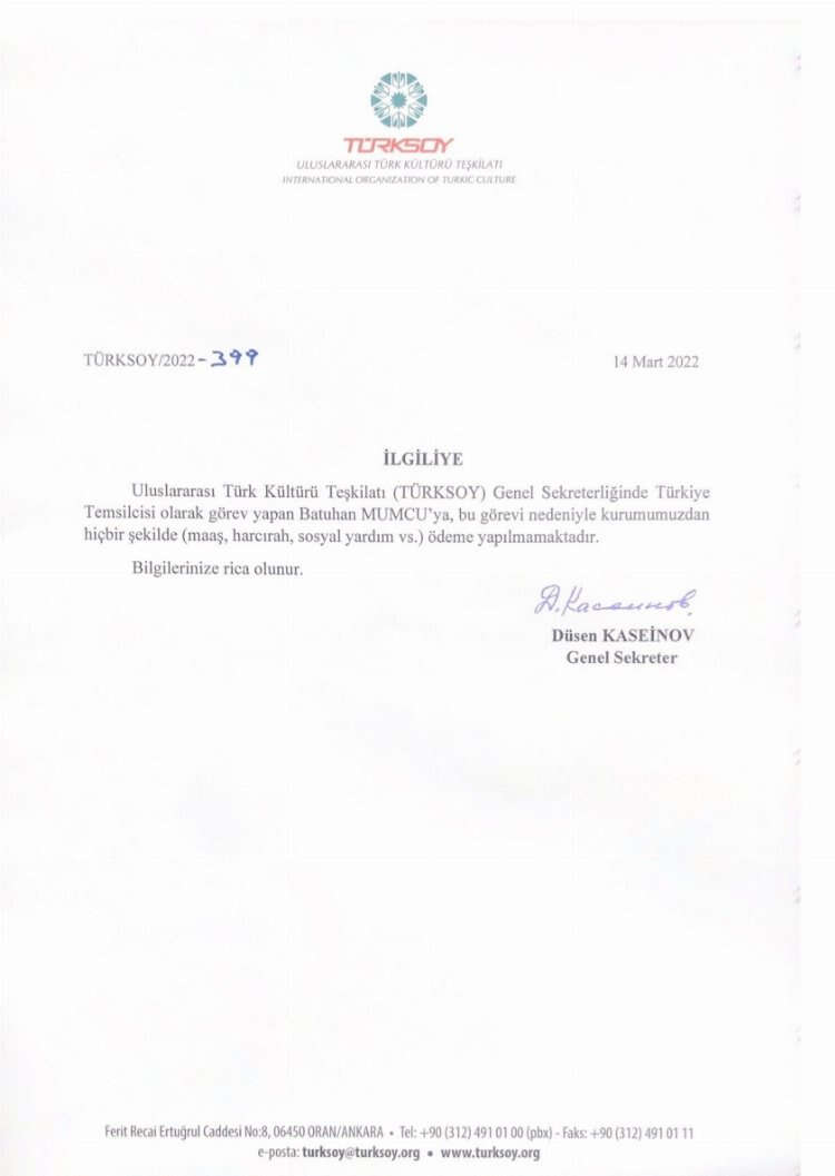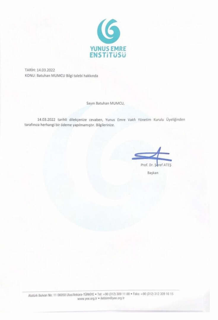 “Abi çamur at izi kalsın siyaseti maalesef beni de buldu. Kamuda çalışan birisi birden fazla yerden maaş alamaz, bununla ilgili mevcut mevzuatlar engel, kaldı ki; ben buna rağmen atandığım ilk gün itibari ile vermiş olduğum yazılı dilekçeler ile vakıf olan Yunus Emre Enstitüsü ve uluslarası kuruluş olan TÜRKSOY’dan böyle bir hak olan ücreti almak istemediğimi dilekçe ile başvurarak belirtmiştim. Fakat, yalan yanlış bilgiler ile insanları kamuda çalışan bürokratlara karşı olumsuz etkilemeyi siyaset sananların son kurbanı oldum. Böyle bir siyasete alet edilmekten hiç de memnun olmadığımı belirtmek isterim.”