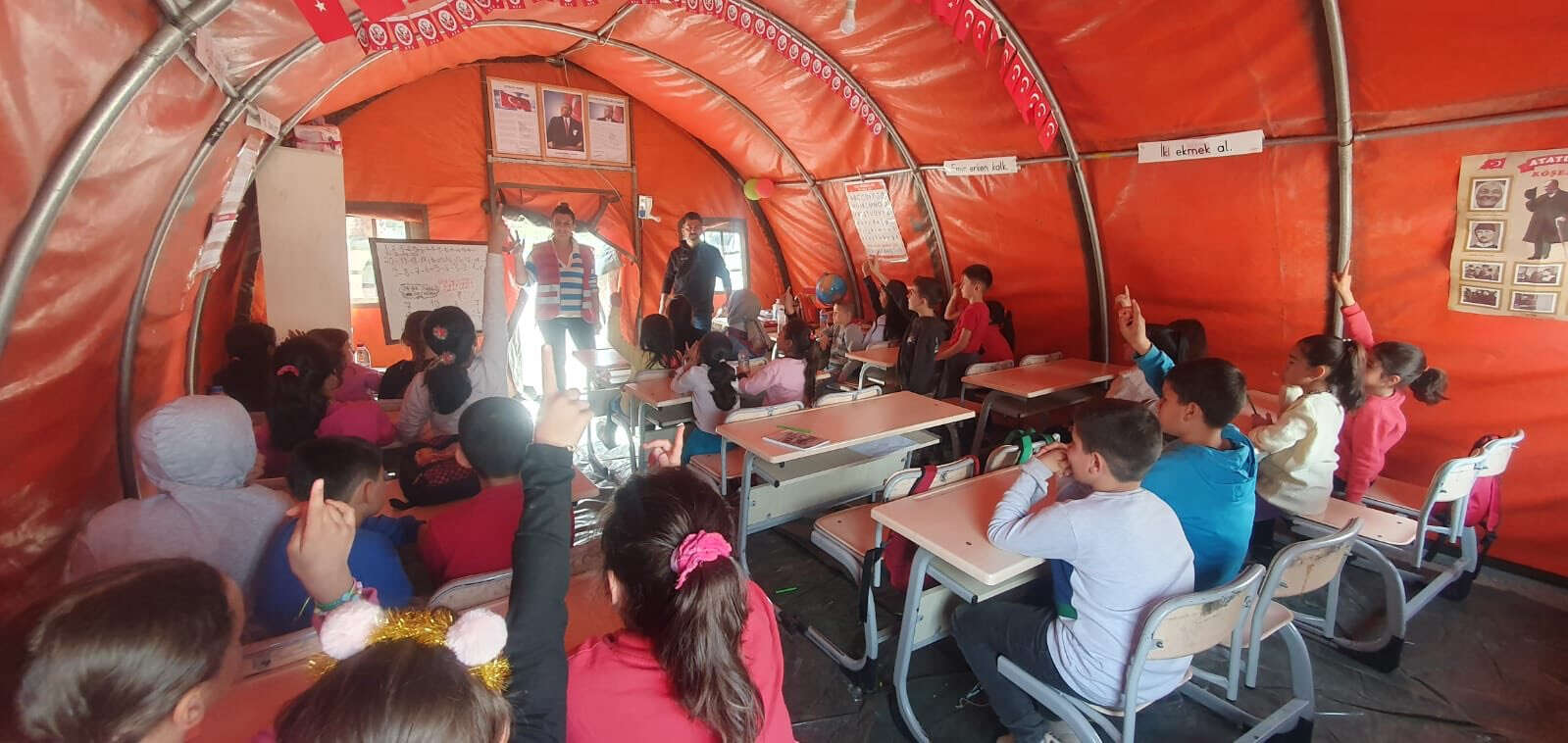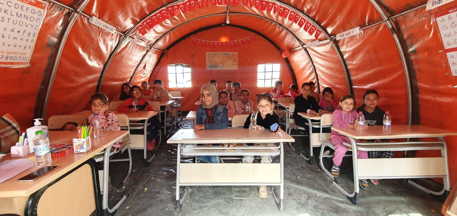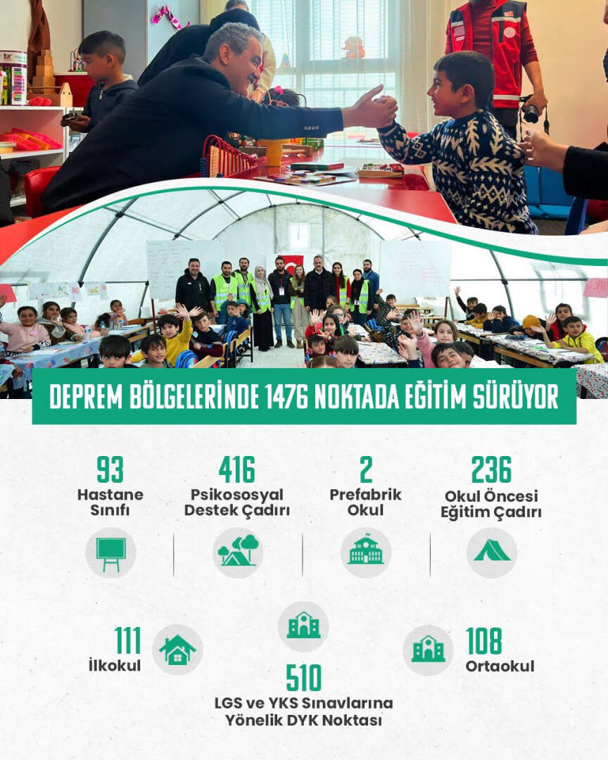 Deprem bölgesinde konteynır okullarda hastane sınıfı, psikososyaldestek çadırları, LGS ve YKS destek kursları depremzede çocuklara eğitim veriyor.
