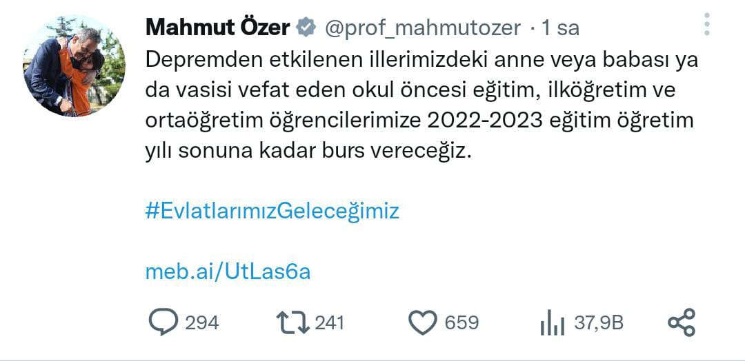 Milli Eğitim Bakanı Mahmut Özer sosyal medya hesabından yağptığı paylaşımla depremde ailesini ve yakınlarını kaybeden öğrencilerin eğitimi için burs verileceğini açıkladı. Bakan Özer yaptığı paylaşımda "Depremden etkilenen illerimizdeki anne veya babası ya da vasisi vefat eden Okul Öncesi eğitim, İlköğretim ve Ortaöğretim öğrencilerimize 2022-2023 Eğitim Öğretim yılı sonuna kadar burs vereceğiz" dedi.