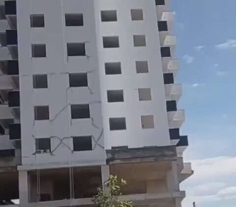 İnşaat işçileri henüz inşaatı tam olarak bitmemiş binadaki çatlakları sıvarken kaydedilen görüntüler büyük tepkiler aldı.