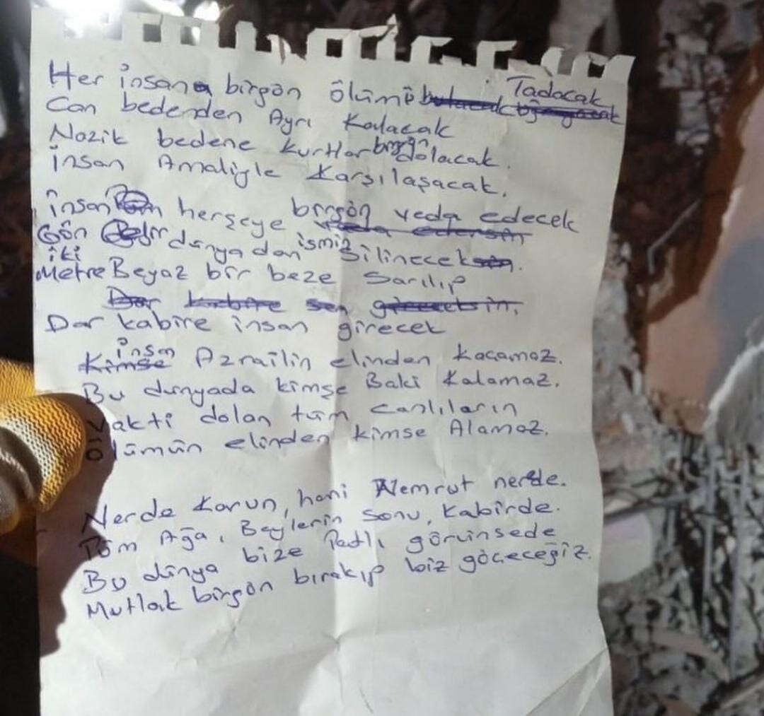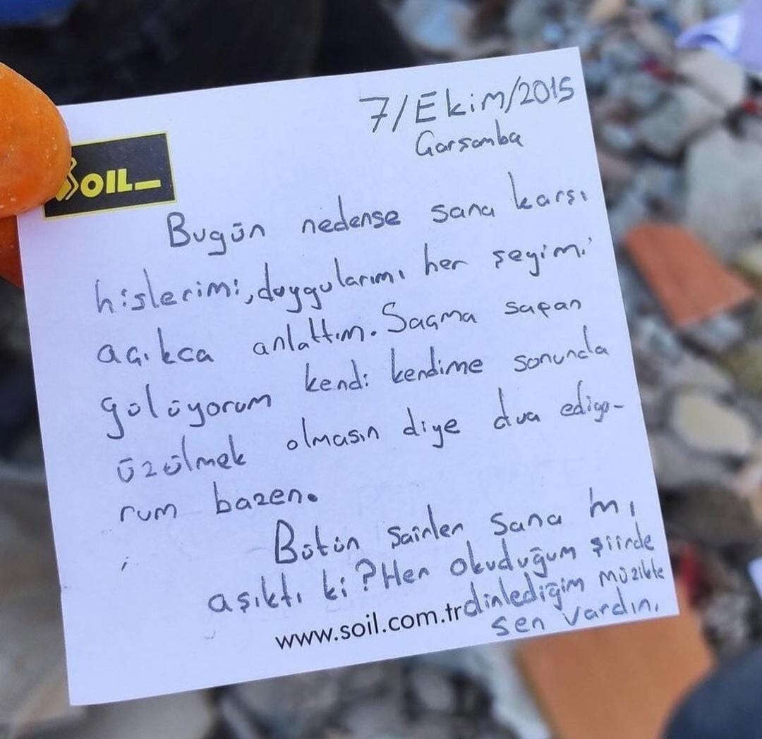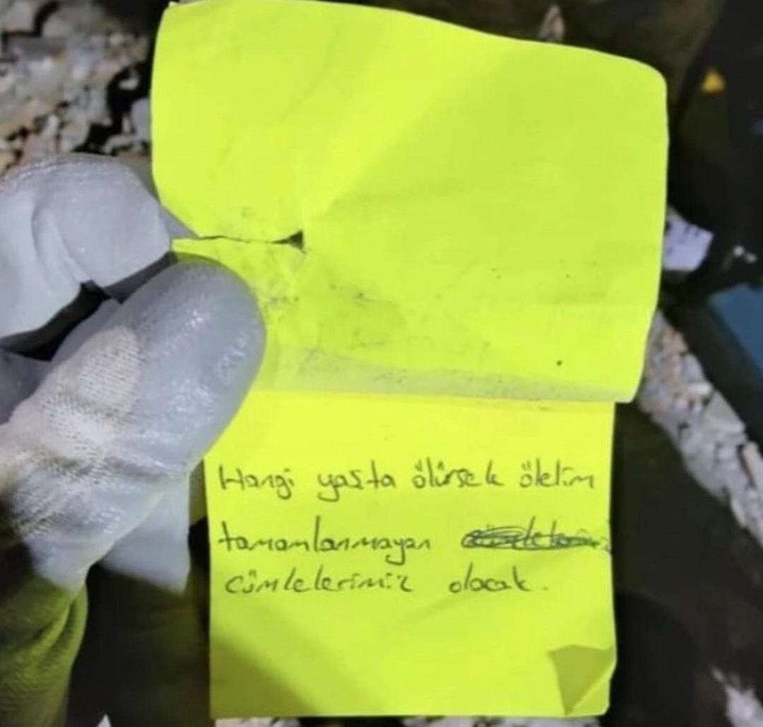Depremde enkazın altından çıkan bu notta yazan 'Hangi yaşta ölürsek ölelim, yarım kalan hikayelerimiz olacak' sözleri belki de depremde hayatını kaybeden bir gence aitti.