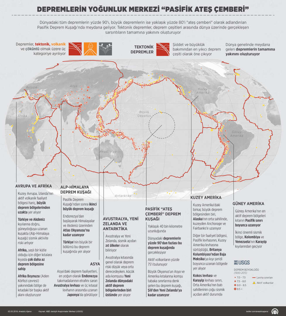 Anadolu Haber Ajansı'nın paylaştığı verilerde; Dünyadaki tüm depremlerin yüzde 90'ı, büyük depremlerin ise yüzde 81'i "ateş çemberi" olarak adlandırılan Pasifik Deprem Kuşağı'nda meydana geliyor.