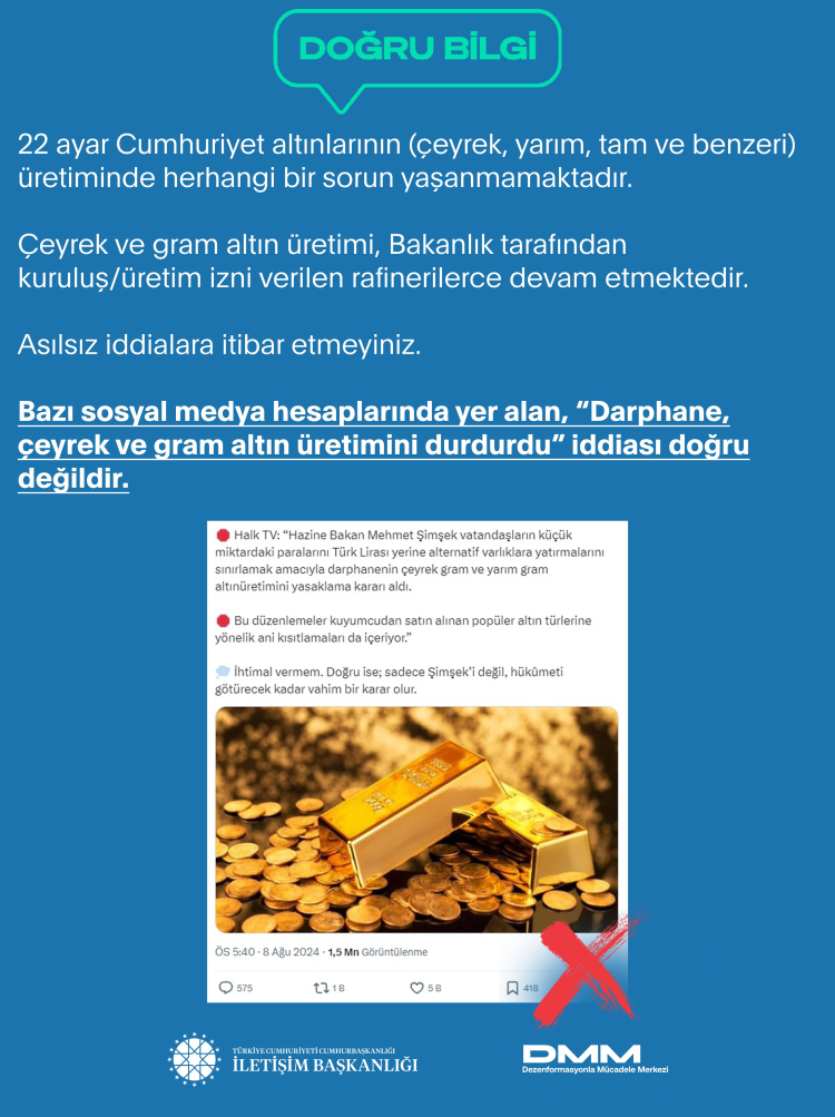 Bazı sosyal medya hesaplarında yer alan, “Darphane, çeyrek ve gram altın üretimini durdurdu” iddiası doğru değildir.