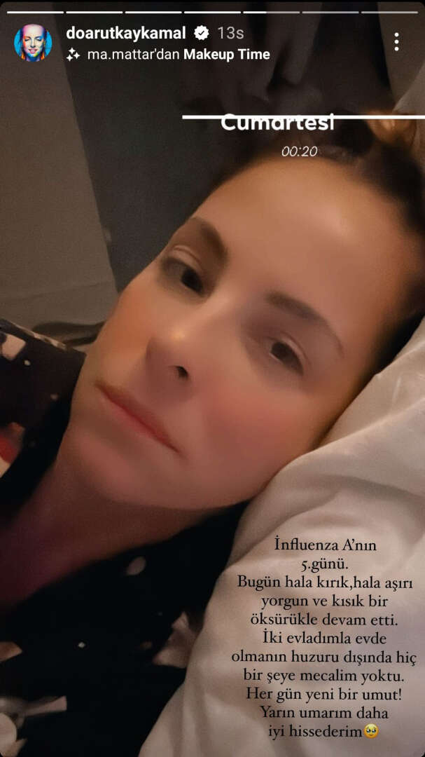 Hastalığının beşinci gününde de yorgunluk, kırıklık ve öksürüğünün devam ettiğini belirten ünlü oyuncu Doğa Rutkay, "Yarın umarım daha iyi hissederim" mesajı verdi. Covid hastalığını bile mumla aradığını belirten Rutkay, Kerimcan Kamal ile evli ve iki çocuğu bulunuyor.