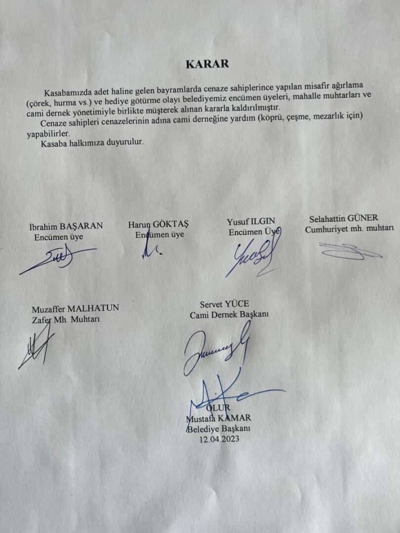 Konuyla ilgili alınan karar metninde; “Kasabamızda adet haline gelen bayramlarda cenaze sahiplerince yapılan misafir ağırlama (çörek, hurma vs.) ve hediye gönderme olayı belediye encümen üyeleri, mahalle muhtarları ve cami dernek yönetimiyle birlikte müşterek alınan kararla kaldırılmıştır.