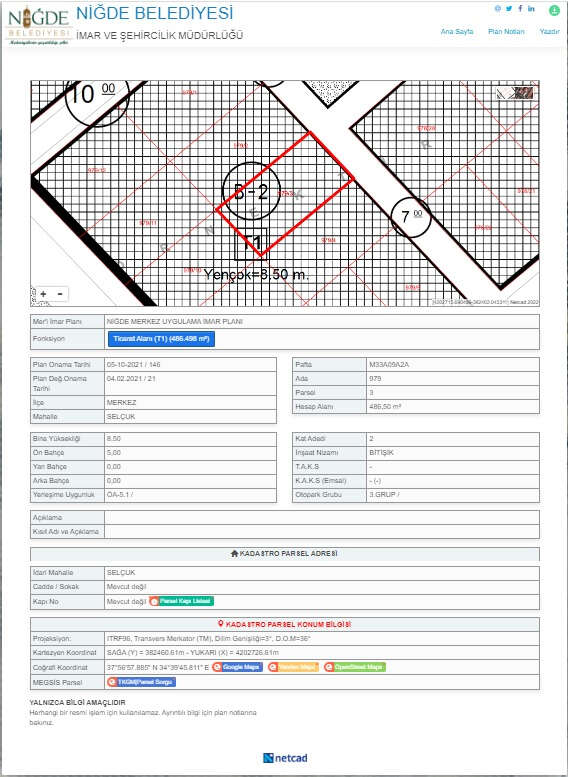 Niğde Belediyesi’nin dijital platformlarında erişime açtığı e-imar uygulamasıyla parsellerin imar durumları, imar planı tadilatları ve imarla ilgili her türlü bilgi internet üzerinden şeffaf bir şekilde takip edilebiliyor.