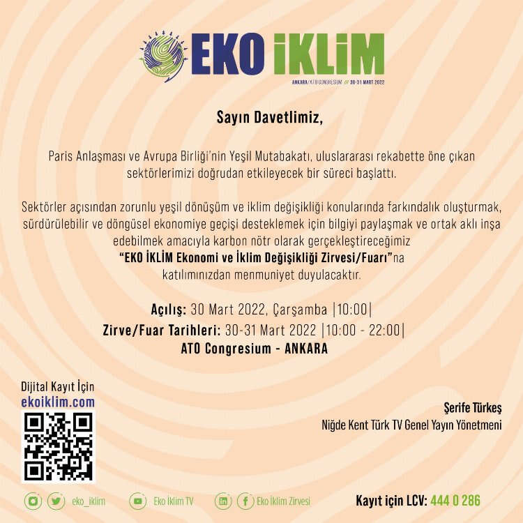 Niğde’den Eko İklim Zirvesi’ne konuşmacı olarak davet edilen Küresel Gazeteciler Konseyi Niğde İl Temsilcisi, Medya Haber Genel Yayın Yönetmeni, Kent Türk Televizyonu Niğde Temsilcisi Şerife Türkeş ise 2 gün sürecek olan zirvenin 2. gün oturumunda ‘Medya Gözüyle İklim Krizini’ anlatacak.