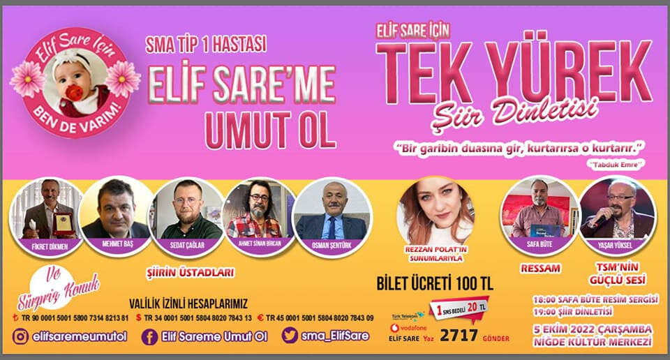 Niğde’de SMA hastası Elif Sare için şiir dinletisi düzenlendi. Niğde’nin gönüllüleri, Rezzan Polat’ın sunumuyla SMA hastası Elif Sare bebek için Kültür Merkezi’nde şiir dinletisi düzenledi. Dinletide Sedat Çağlar, Ahmet Sinan Bircan, Osman Şentürk, Yaşar Yüksel, Mehmet Baş ve Fikret Dikmen sahne aldı.