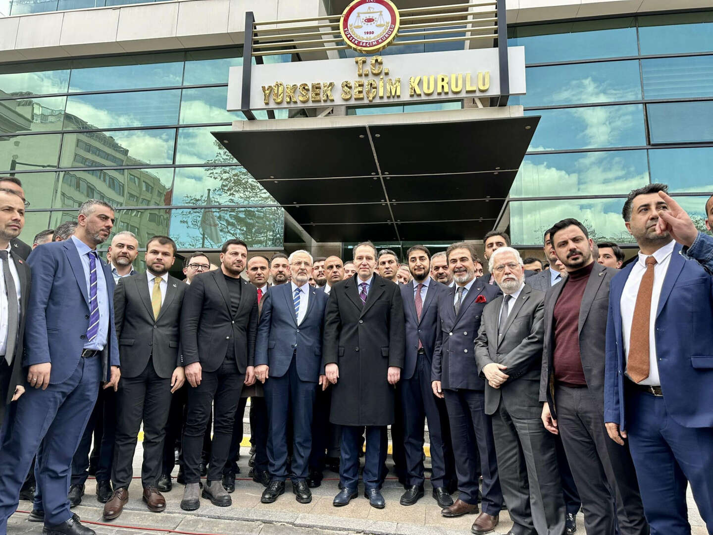 Yüksek Seçim Kuruluna giderek Cumhurbaşkanlığı adaylığına başvuru yapan Fatih Erbakan partililerle böyle poz verdi..