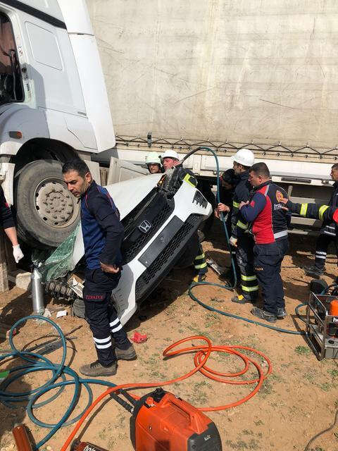 Araçta sıkışan kazazedelerin çıkarılması için yapılan kurtarma çalışmaları devam ederken, araçta sıkışan yaralılar, sıkıştıkları yerden itfaiye ekiplerinin kesici-ayırıcı yardımıyla araçta sıkıştıkları yerlerden çıkarıldı.
