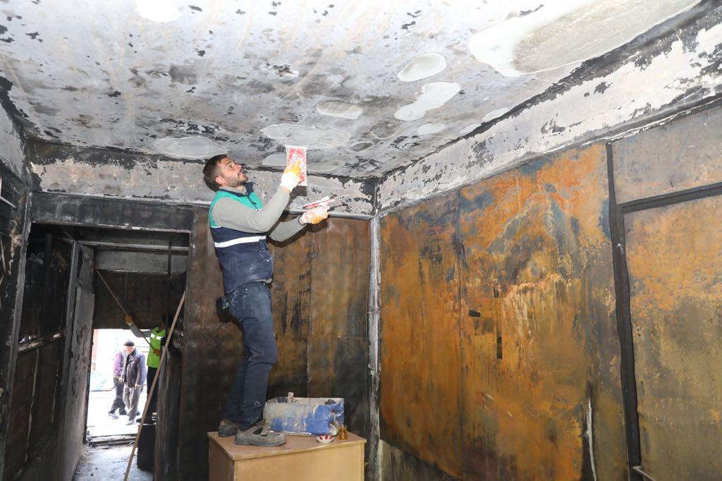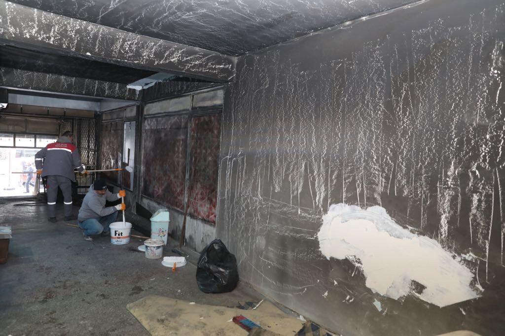 Belediye ekipleri yangında zarar gören yerlerin tadilatını gerçekleştirerek esnafların mağduriyetini giderdi.