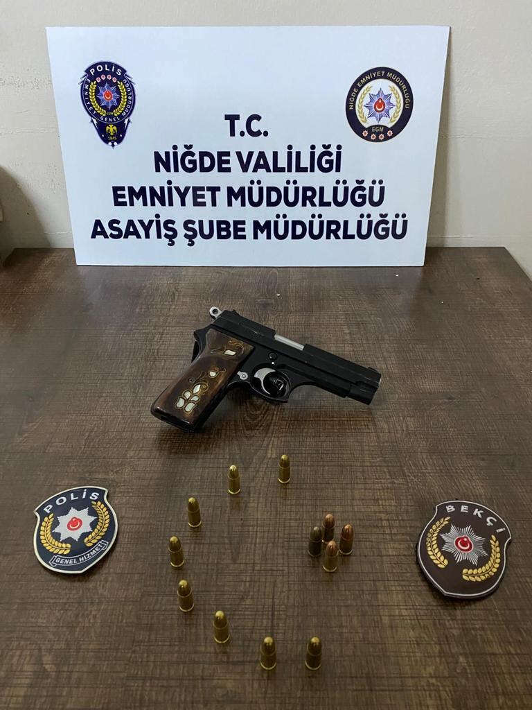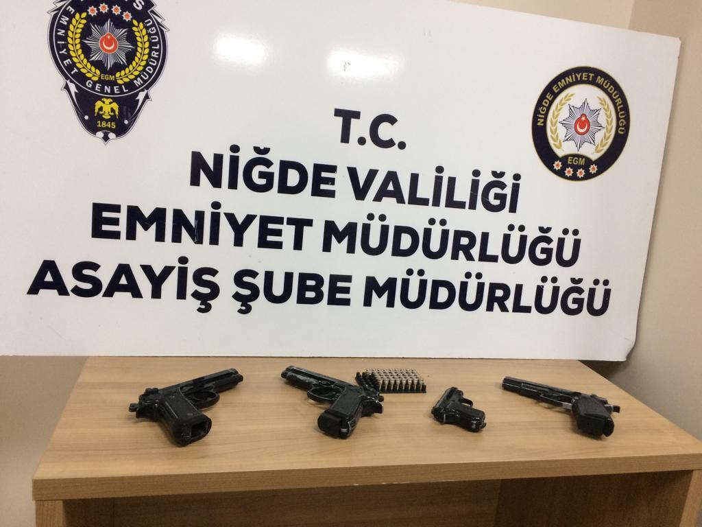 Niğde Asayiş Şube ekiplerinin yaptığı çalışmalarda 10 adet ruhsatsız tabanca, 3 adet tüfek, 2 adet bıçak, 1 adet balta, 1 adet satır, 1 adet muşta, 1 adet kelepçe, 92 adet fişet ele geçirildi.