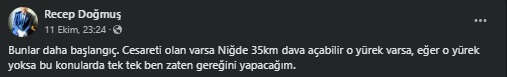 Sosyal medyada dile getirdiği iddiaların ardından hodri meydan diyen Belediye Başkanı Recep Doğmuş; ‘Bunlar daha başlangıç. Cesareti olan varsa Niğde 35km dava açabilir o yürek varsa, eğer o yürek yoksa bu konularda tek tek ben zaten gereğini yapacağım.’’ dedi.