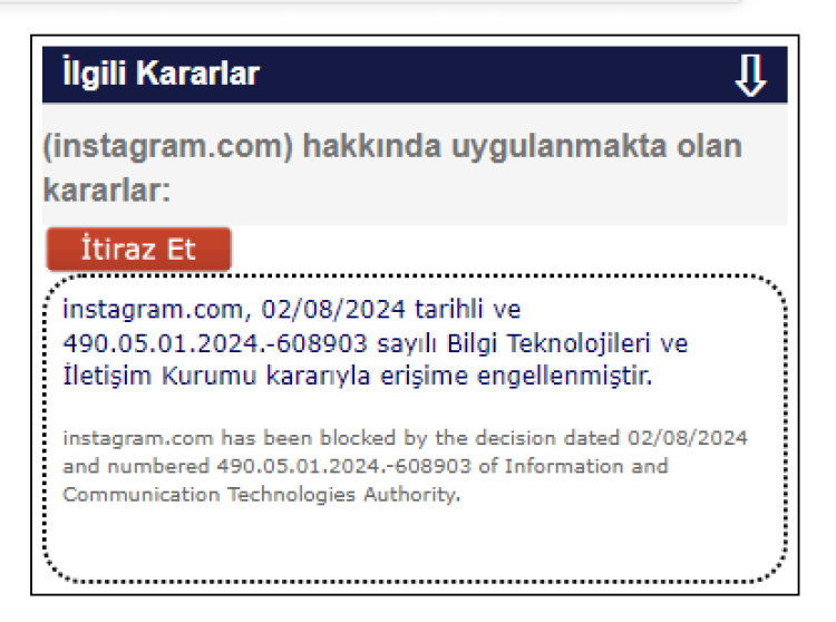 BTK'nin site bilgileri sorgulama menüsünden Instagram'a erişim engeli kararı alındığı öğrenilirken kurumdan yapılan açıklamada "Instagram katalog suçlara uymadığı gerekçesiyle kapatıldı" ifadelerine yer verildi. Erişim engelinin ne kadar süreceğine yönelik bir açıklama ise yapılmadı.