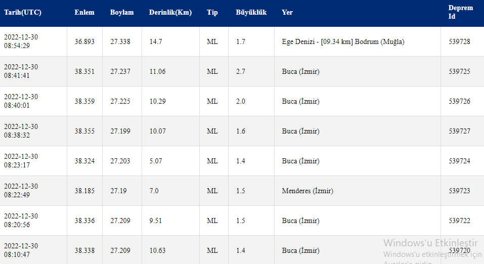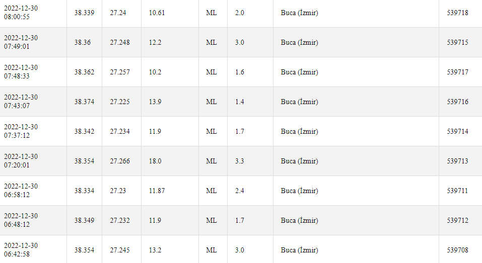 Afet ve Acil Durum Yönetimi Başkanlığı’nın açıkladığı verilere göre 30 Aralık gecesi 00.20 sularında İzmir’de 1.0 büyüklüğünde meydana gelen deprem belirli saat aralığında ve farklı kesimlerde şiddetini artırarak devamlılığını sürdürdü.