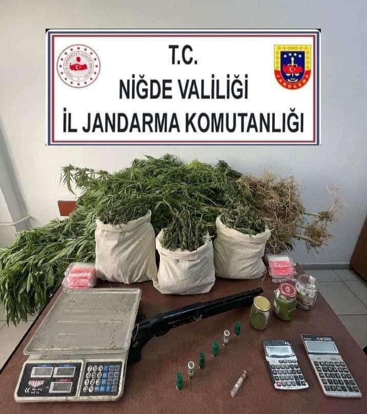 Niğde İl Jandarma Komutanlığı ekipleri tarafından yapılan operasyonda 4 bin 318 gram kubar esrar, 166 gram toz esrar, 213 kök kenevir bitkisi, 12 gram kenevir tohumu, 1 adet ruhsatsız av tüfeği ve 6 adet fişek ele geçirildi.