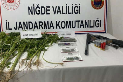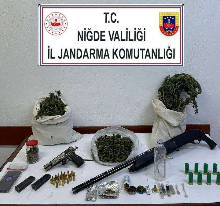 Niğde ili Merkez ilçesi Ağcaaşar Kasabasında yasadışı kenevir ekimi yaptığı tespit edilen şahsın ev ve eklentilerinde adli makamlardan alınan arama kararına istinaden 29 Eylül 2022 tarihinde yapılan arama neticesinde; 3035 gram kubar esrar, 13 adet Uyuşturucu Kullanma Aparatı, 1 adet ruhsatsız tabanca ve bu tabancaya ait 26 adet 9 mm fişek, 1 adet ruhsatsız av tüfeği ve bu tüfeğe ait 9 adet fişek ele geçirildi.
