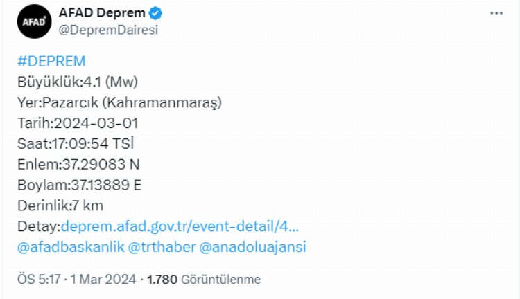 Afet ve Acil Durum Yönetimi Başkanlığı, (AFAD) Kahramanmaraş'ın Pazarcık ilçesinde saat 17.09'da 4.1 büyüklüğünde deprem meydana geldiğini bildirdi.