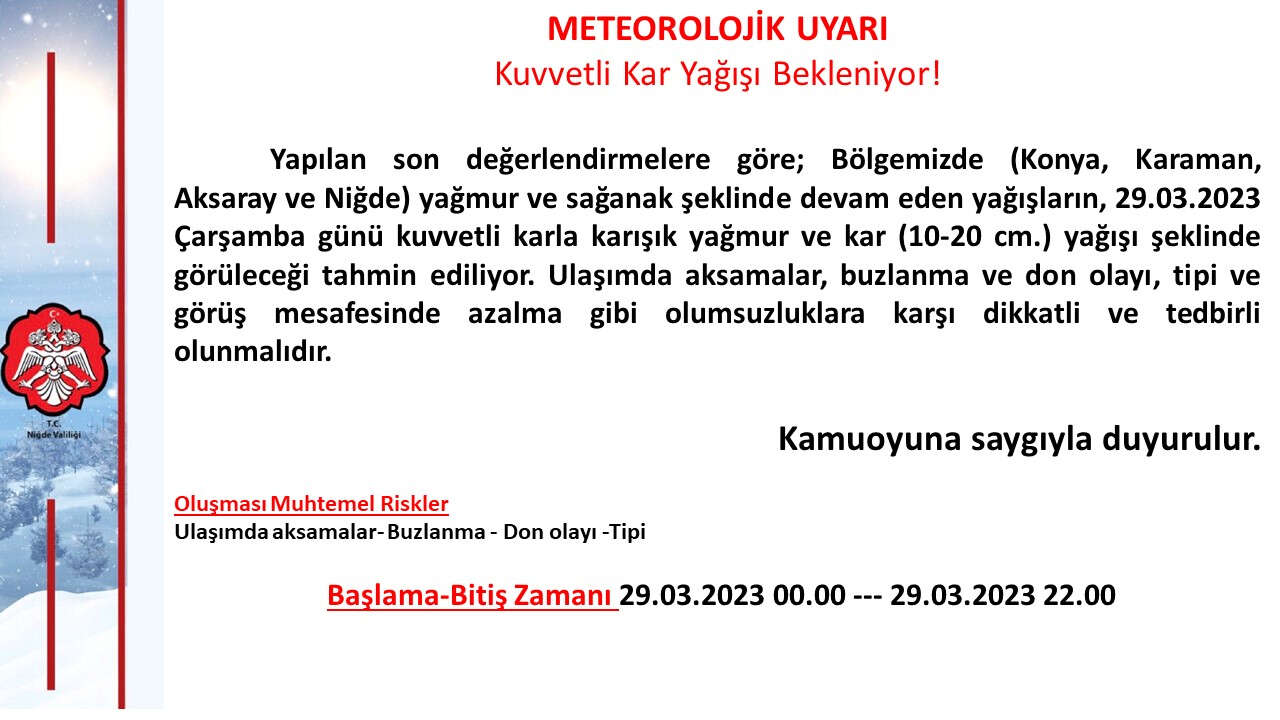 Konya, Niğde, Aksaray, Kırşehir, Nevşehir ve Kayseri, Yozgat ve Sivas çevreleri, Ankara'nın ve Kırıkkale'nin güney ilçeleri ile Karaman'ın yüksek kesimlerinde kuvvetli karla karışık yağmur ve kar, Sivas’ın ve Yozgat’ın yüksek kesimlerinde yer yer yoğun kar yağışı bekleniyor.