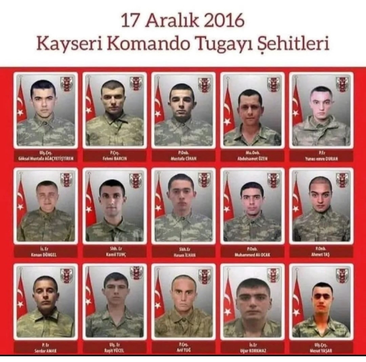 Kayseri'de, 17 Aralık 2016'da çarşı iznine çıkan askerleri taşıyan halk otobüsüne yönelik patlayıcı yüklü araçla düzenlenen terör saldırısında şehit olan 15 asker anıldı.