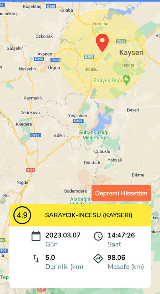 7 Mart 2023 tarihi saat 14.47'de Kayseri sınırları içinde 4.9 şiddetinde deprem oldu. 10 dakika sonra yaşanan ikinci depremin ardından Kayseri'de vatandaş sokağa döküldü. Kayseri ve Niğde'de hissedilen depremde ilk belirlemelere göre can kaybı yaşanmadı.