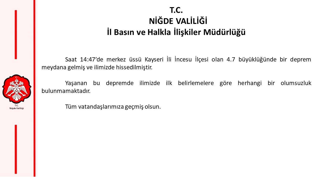 Kayseri il sınırları içinde yaşanan iki depremin ardından açıklama yayımlayan Niğde Valiliği şunlara değindi;