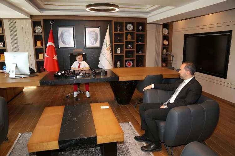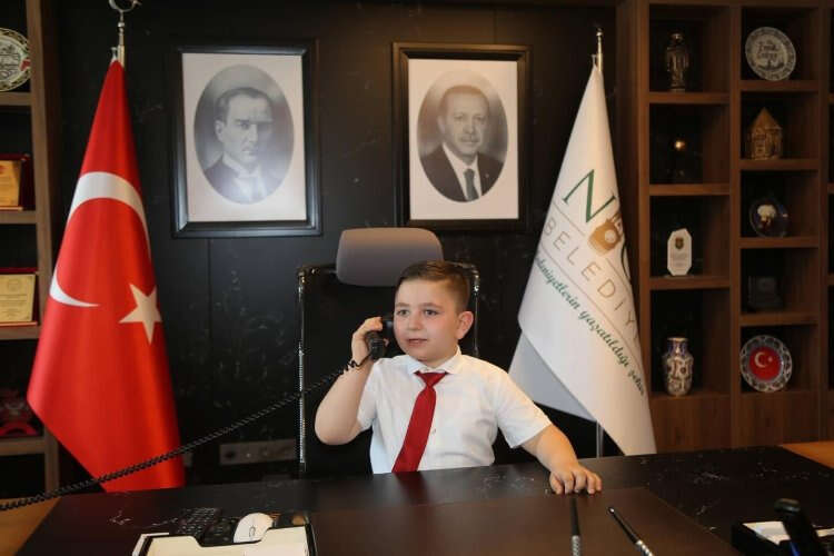 23 Nisan Ulusal Egemenlik ve Çocuk Bayramı dolayısıyla çocukları makamında ağırlayan Başkan Özdemir, makamını Emine Çetintürk Anaokulu öğrencisi 6 buçuk yaşındaki Eymen Güçlüer'e bıraktı.