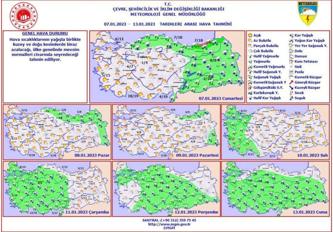 Meteoroloji’den gelen haftalık hava durumu tahminlerinde 7-13 Ocak tarihlerinde hava sıcaklığı İç Anadolu ve Doğu Karadeniz’de 2 ila 4 derece azalacağı bildirildi.