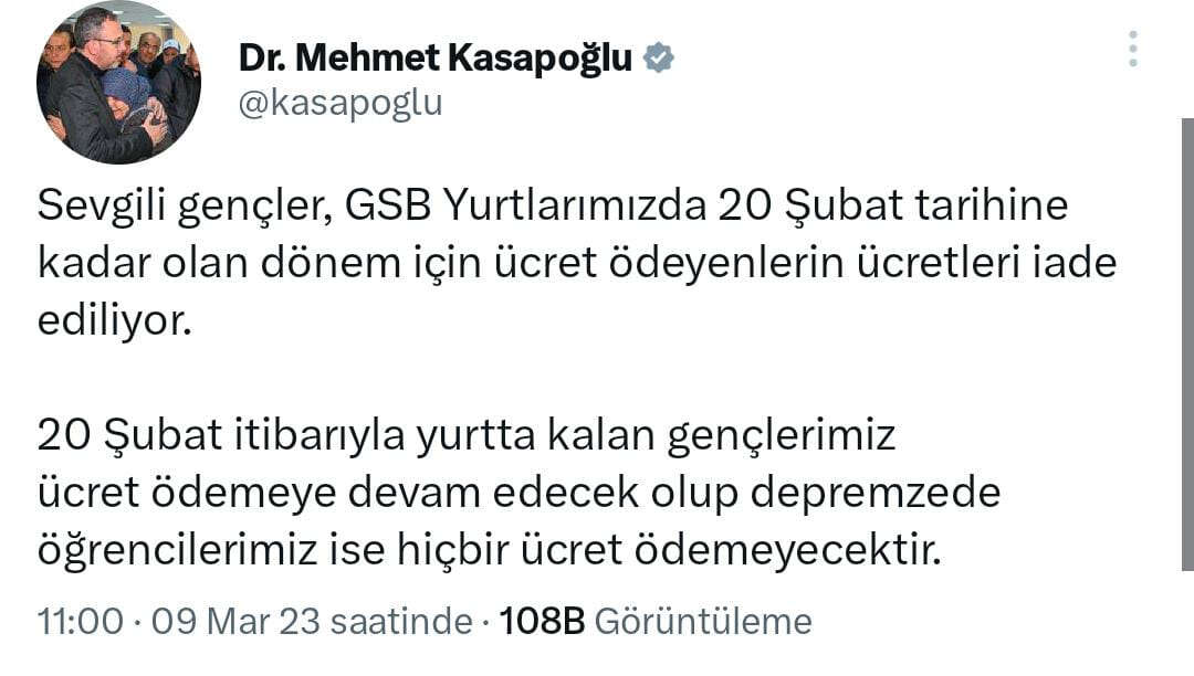 Gençlik Spor Bakanı Mehmet Kasapoğlu sosyal medyada yaptığı duyuruda depremzede öğrencilerin ödeme yapmayacağını belirterek şunları söyledi: