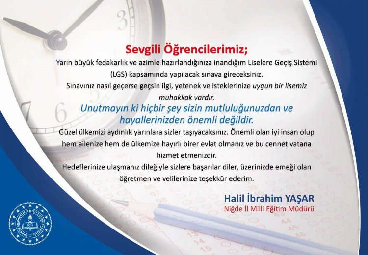 5 Haziran 2022 Pazar günü gerçekleşen sınavlardan önce Niğde İl Milli Eğitim Müdürü Halil İbrahim Yaşar da öğrencilere başarılar dilemiş, bir mesaj yayınlamıştı.