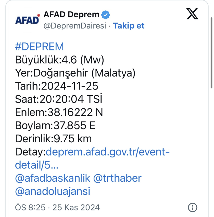 Afet ve Acil Durum Yönetimi Başkanlığı (AFAD), Malatya'nın Doğanşehir ilçesinde 4,6 büyüklüğünde bir deprem meydana geldiğini duyurdu. AFAD'ın verilerine göre, saat 20:20:04'te gerçekleşen depremin derinliği 9,75 kilometre olarak ölçüldü.