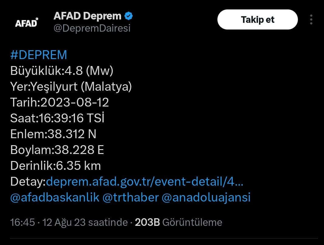 Malatya’nın Yeşilyurt İlçesinde peş peşe meydana gelen depremler, Afet ve Acil Durum Yönetimi Başkanlığı’nın (AFAD) verilerine göre şu şekilde;