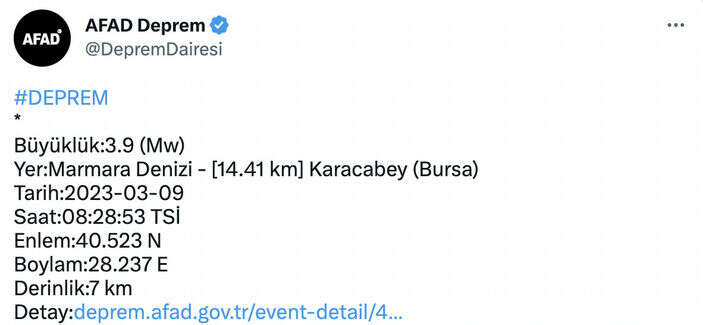 Afet ve Acil Durum Yönetimi Başkanlığı'nın (AFAD) sitesinde yer alan bilgiye göre, Marmara Denizi açıklarında denizin yaklaşık 7 kilometre altında 3.9 büyüklüğünde deprem meydana geldi.