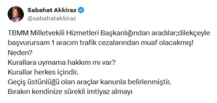 Akkiraz açıklamasında, "TBMM Milletvekili Hizmetleri Başkanlığından aradılar ve dilekçeyle başvurmam halinde bir aracımın trafik cezalarından muaf tutulacağını söylediler. Neden? Kurallara uymama hakkım mı var? Kurallar herkes içindir. Geçiş üstünlüğü olan araçlar yasa ile belirlenmiştir. Lütfen kendinize sürekli ayrıcalık yaratmaktan vazgeçin." ifadelerine yer verdi.