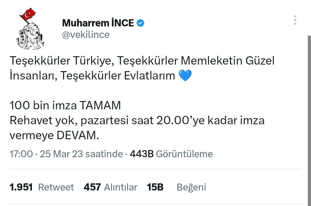 100 bin imzaya ulaşan İnce şu mesajı paylaştı: