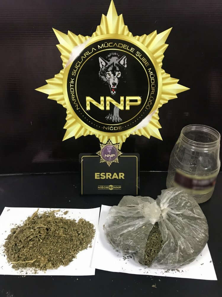 Niğde İl Emniyet Müdürlüğü Narkotik Suçlarla Mücadele Şube Müdürlüğü ekiplerince 14 Mart - 21 Mart 2022 tarihlerinde arasında gerçekleştirilen operasyonlarda yakalanan 24 şahıstan 342 gram ağırlığında ESRAR, 208,68 gram ağırlığında SENTETİK KANNABİNOİD BONZAİ, 21,31 gram ağırlığında EROİN, 4,73 gram ağırlığında METAMFETAMİN, 2 adet SENTETİK ECZA ele geçirildi.