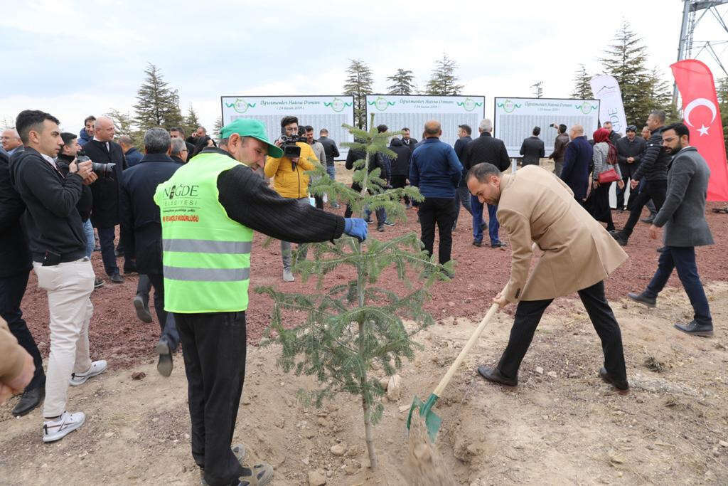 Kent Ormanında, Niğde Belediyesi tarafından oluşturulan ‘Öğretmenler Hatıra Ormanında” düzenlenen etkinlikte protokol üyeleri, öğretmenler ve öğrenciler tarafından öğretmenler için fidan dikildi.