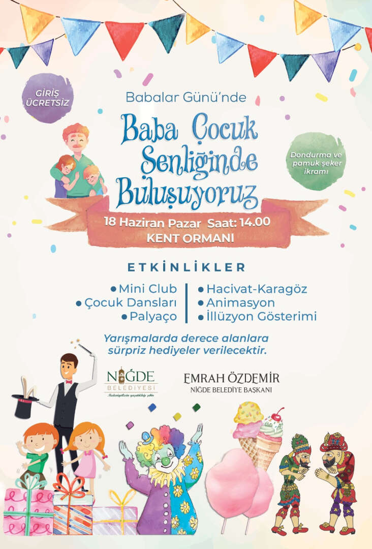 Niğde Belediye Başkanı Emrah Özdemir, Babalar Gününe yönelik olarak güzel bir program hazırladıklarını dile getirerek konuyla ilgili şu açıklamalarda bulundu; “18 Haziran 2023 tarihinde Kent Ormanında saat 14:00’de Babalar Günü etkinliği kapsamında “Baba Çocuk Şenliği” programı düzenleyeceğiz. Programda yarışmalar, mini club, çocuk dansları, palyaço, HacivatKaragöz, animasyon ve illüzyon gösterimi yapılacaktır. Dondurma ve pamuk şeker ikramı yapılacak olan programda yarışmalarda derece alanlara sürpriz hediyeler verilecektir. Bütün vatandaşlarımızı programımıza katılmaya davet ediyor kıymetli babalarımızın babalar gününü kutluyorum.” dedi.
