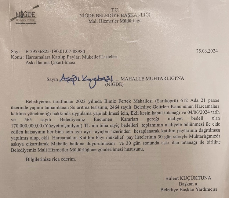 Geçtiğimiz gün, Niğde Belediye Başkanı Emrah Özdemir adına Başkan Yardımcısı Bülent Küçüktuna imzalı muhtarlıklara gönderilen duyuruda, Niğde Belediyesi tarafından yapılan atık su arıtma tesisinin 170 milyon TL'lik bedelinin, emlak mükellefi olanlara bölünerek askıya çıkarılmasını istendi. Duyuruda ''Belediyemiz tarafından 2023 yılında İlimiz Fertek Mahallesi (Sarıköprü) 612 Ada 21 parsel üzerinde yapımı tamamlanan Su arıtma tesisinin, 2464 sayılı Belediye Gelirleri Kanununun Harcamalara ve 565 sayılı Belediyemiz Encümen Kararları gereği maliyet bedeli olan 170.000.000,00 (Yüzyetmişmilyon) TL nin bina rayiçleri üzerinden hesaplanarak katılım paylarının dağıtılması yapılmış olup, ekli Harcamalara Katılım Payı mükellef pay listelerinin 30 gün süreyle Muhtarlığınızda askıya çıkartılarak Mahalle halkına duyurulmasını ve 30 gün sonunda askı ilan tutanağı ile birlikte Belediyemiz Mali Hizmetler Müdürlüğüne gönderilmesini rica ederim.'' ifadeleri kullanıldı.
