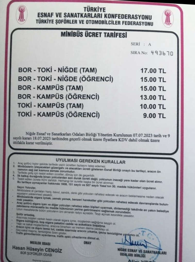 Niğde Esnaf ve Sanatkarları Odaları Birliği Yönetim Kurulunun kararı ile 18 Temmuz Salı (bugün) günü itibariyle geçerli olmak üzere Niğde kent merkezi ve Bor ilçesi arası minibüs ücretlerine zam geldiği açıklandı.